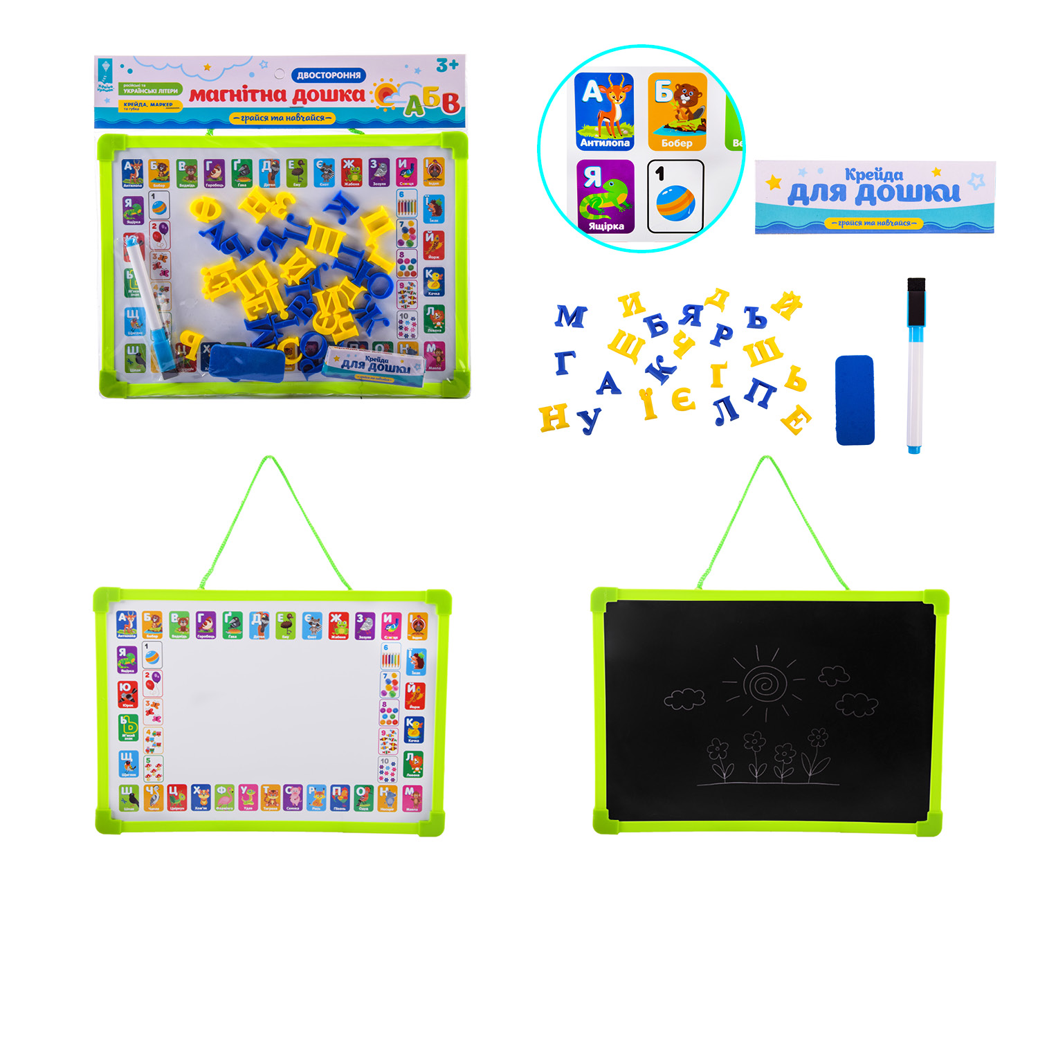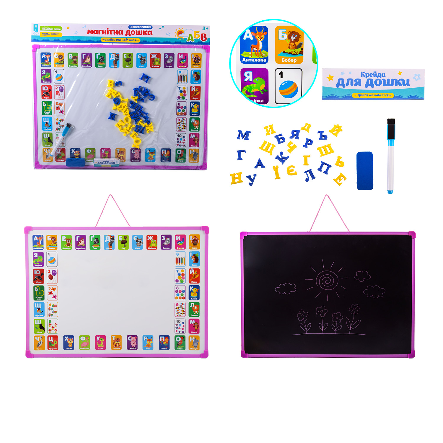 Дошка 2-х стор арт. PL-7005ua (96шт/3) УКР магніт літери, крейда, маркер, губка в пакеті – 30*28 см, р-р дошки – 30*21.5*1.2 см