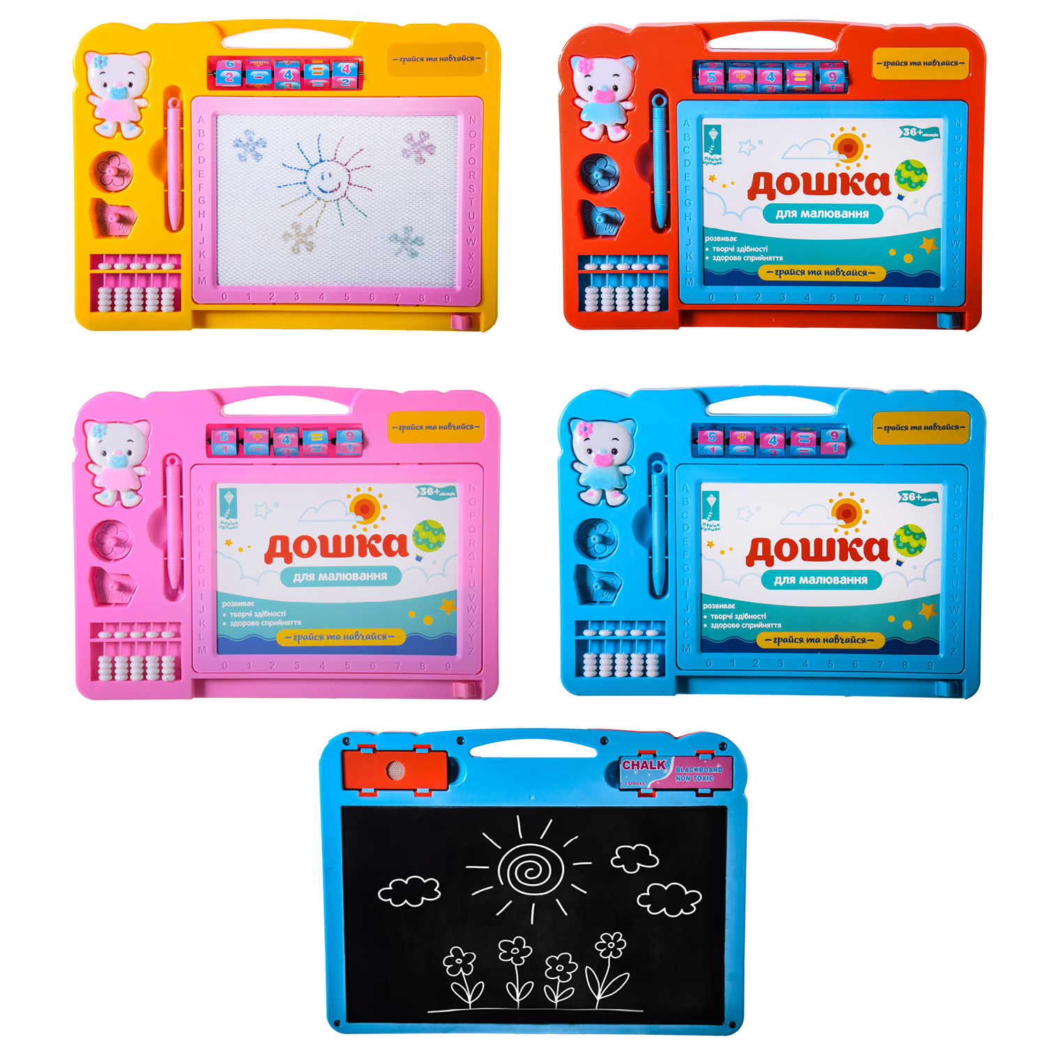 Дошка 2-х сторон арт. PL-0703 URE (12шт)магніт. рос.-укр.-англ.літери, з крейдою, короб.52*7*32, 5 см