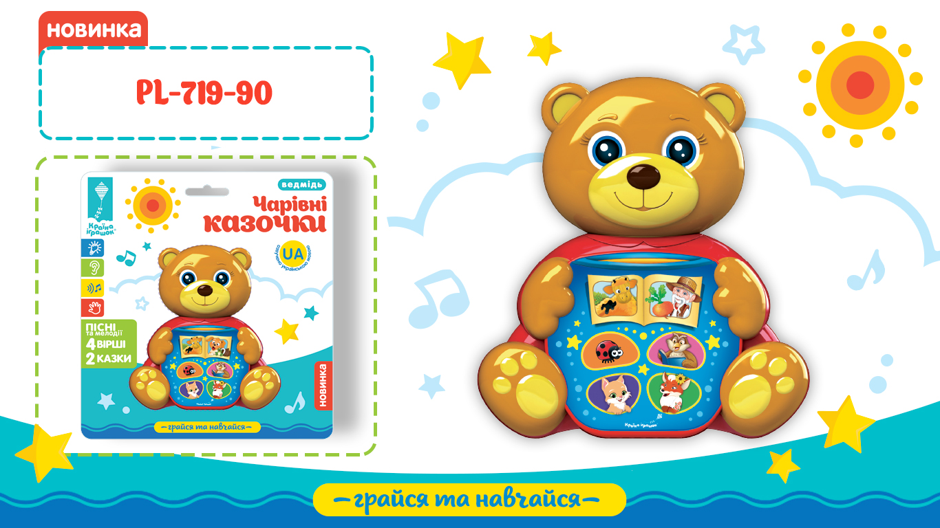 Ведмедик муз. арт. PL-724-04 (48шт/2) "Грайся та навчайся".співає українською мовою, поновлення руху від оплесків у долоні, світло, короб.22, 5*10, 6*15, 5см