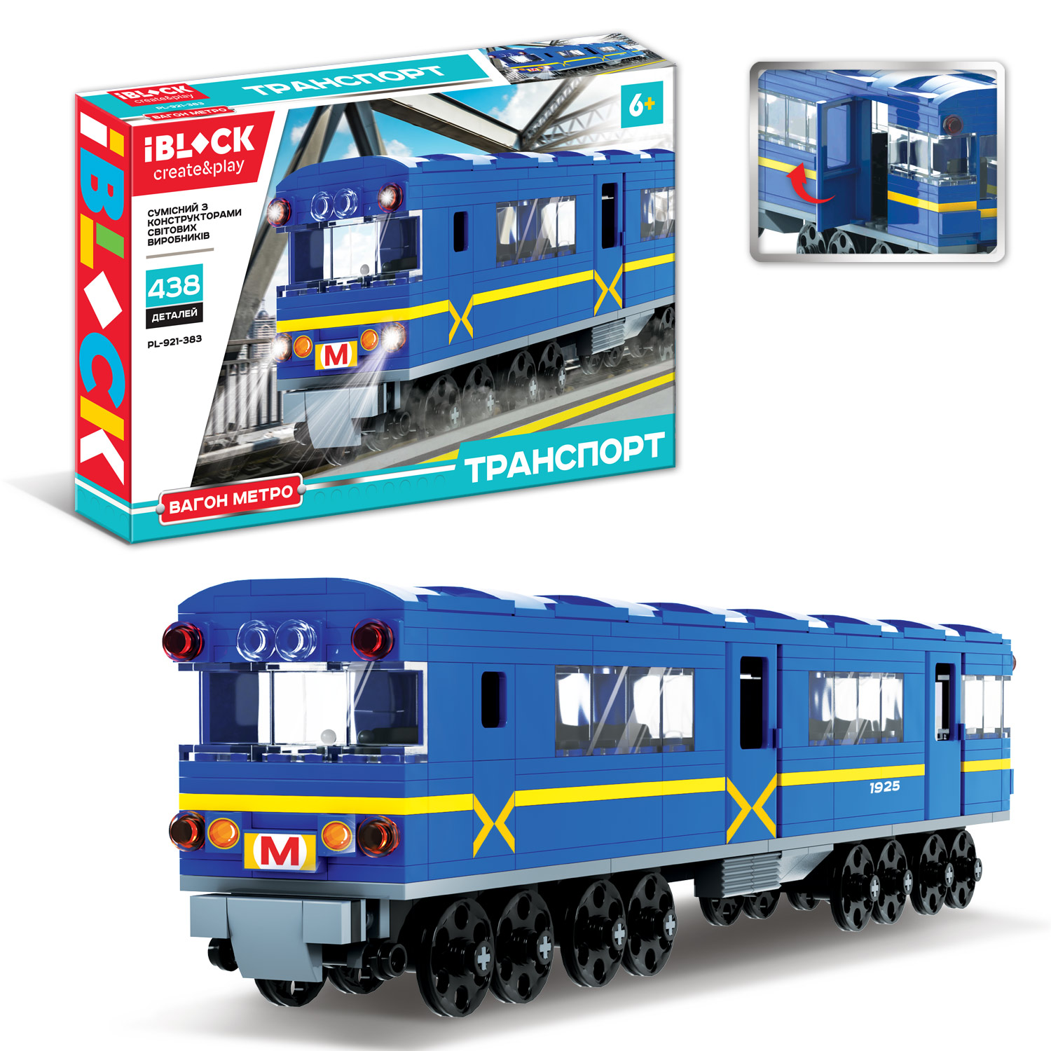 Конструктор IBLOCK арт. PL-921-383 (12шт) ТРАНСПОРТ Вагон-Метро 438 дет., інструкція та наліпки у комплекті, короб. 46*28, 5*6, 4см