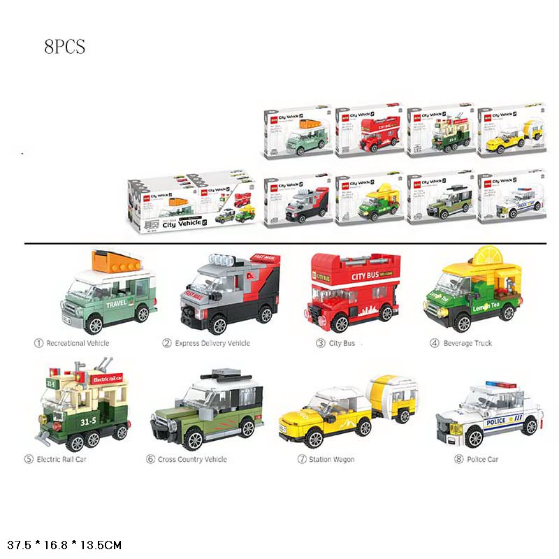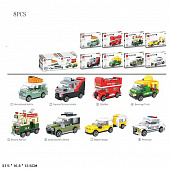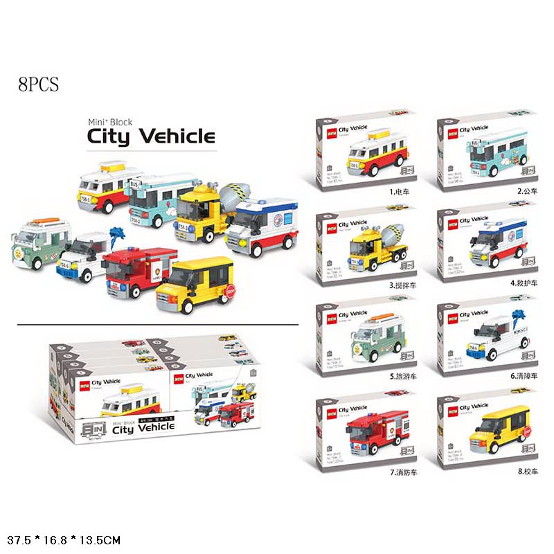 Ігровий набір арт. 758A (144шт/2) транспорт міні блочний, 8 видів, 18уп*8шт у дісплей боксі 37, 5*16, 8*13, 5см